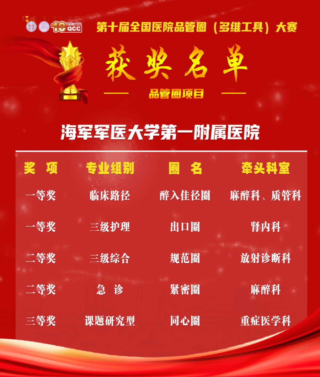 11月25日至27日,第十届全国医院品管圈(多维工具)大赛在上海国际会议中心成功举行。我院5个参赛项目全部获奖,分获一等奖2项、二等奖2项和三等奖1项。